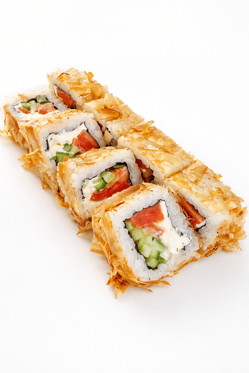 Основа из риса и нори бережно удерживает сливочный творожный сыр, сочный лосось раскрывается мягкой насыщенностью, а свежий огурец ? добавляет лёгкость и хрустящую нотку. Стружка тунца придаёт тонкий копчёно-морской аромат и делает вкус глубже, интереснее и аппетитнее ?