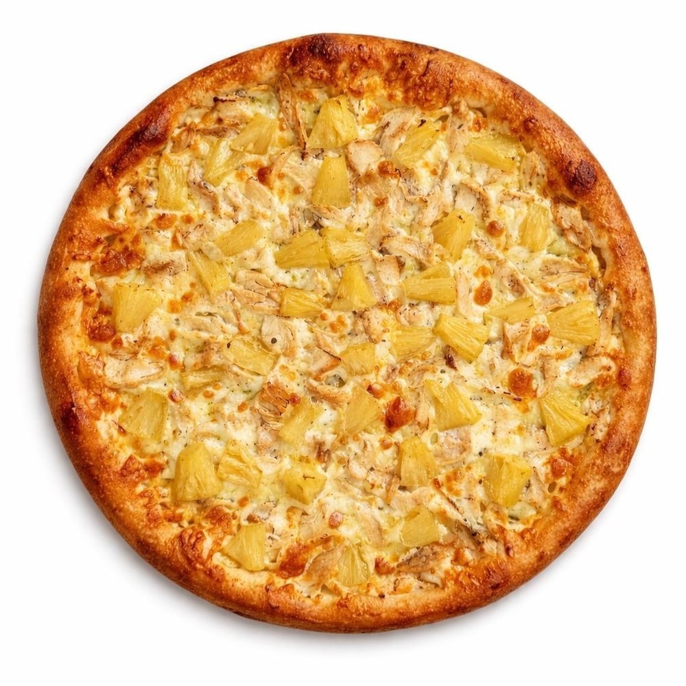 Нежный соус альфредо создаёт сливочную основу, тянущаяся моцарелла ? добавляет мягкость, копчёная курочка ? раскрывается насыщенным вкусом, а ананасы ? дарят сочную сладость и лёгкую кислинку. Контраст солёного и сладкого делает каждый кусочек особенно аппетитным ?