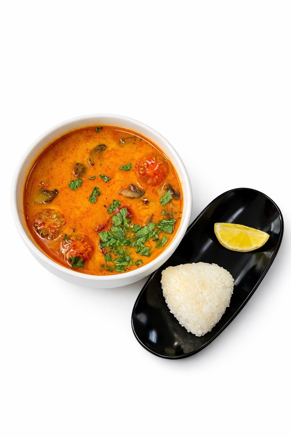 тигровые креветки , кальмары , мидии шампиньоны ,томаты черри . корень имбиря ,кокосовое молоко , рис японский , фреш лимона , кинза , паста том ям .