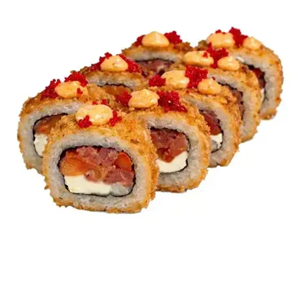 Тунец и лосось создают сочную основу, творожный сыр смягчает вкус, томат добавляет лёгкую свежесть, а соус спайси придаёт выразительную пикантность. Икра масаго усиливает морскую нотку, а хрустящий кляр и сухари делают текстуру ещё более аппетитной Для тех, кто любит роллы с характером и лёгкой остротой.