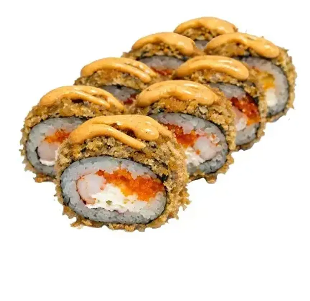 Тигровая креветка и снежный краб дарят сочность и насыщенность, икра масаго добавляет лёгкий хруст, а соус спайси ? придаёт пикантный характер. Всё это в хрустящем кляре и сухарях — с золотистой корочкой и мягкой серединой. Сливочный сыр объединяет вкус в гармоничную композицию